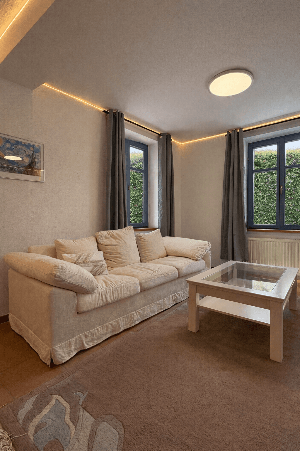 Unser großzügiges Reetdach-Ferienhaus ist der ideale Rückzugsort für Familien und Freundesgruppen von bis zu 8 Personen, die Wert auf Raum, Komfort und Privatsphäre legen. Der traditionelle Baustil mit Reetdach trifft hier auf modernen Wohnkomfort und schafft ein gemütliches Zuhause für Ihren Aufenthalt auf Rügen. Das Haus verfügt über drei separate Schlafzimmer: 1 Schlafzimmer mit komfortablem Doppelbett 2 Schlafzimmer jeweils mit zwei Einzelbetten Zusätzlich bietet das Wohnzimmer mit einer Schlafcouch Platz für bis zu 2 weitere Personen Ein geräumiges Badezimmer mit Dusche sorgt für Komfort und ausreichend Platz auch bei längeren Aufenthalten. Der helle Wohnbereich lädt mit gemütlicher Sitzecke und Schlafcouch zum Entspannen ein – perfekt für gemeinsame Abende. Die voll ausgestattete Küche bietet alles, was Sie für gemeinsame Mahlzeiten benötigen. Im Außenbereich erwarten Sie eine Terrasse und ein Garten, ideal für entspannte Frühstücksmomente oder laue Sommerabende mit Familie und Freunden. Durch die Kombination aus traditionellem Charme, moderner Ausstattung und großzügigem Platzangebot ist dieses Ferienhaus die perfekte Wahl für einen erholsamen Inselurlaub – nur wenige Minuten von der Fähre nach Hiddensee entfernt.